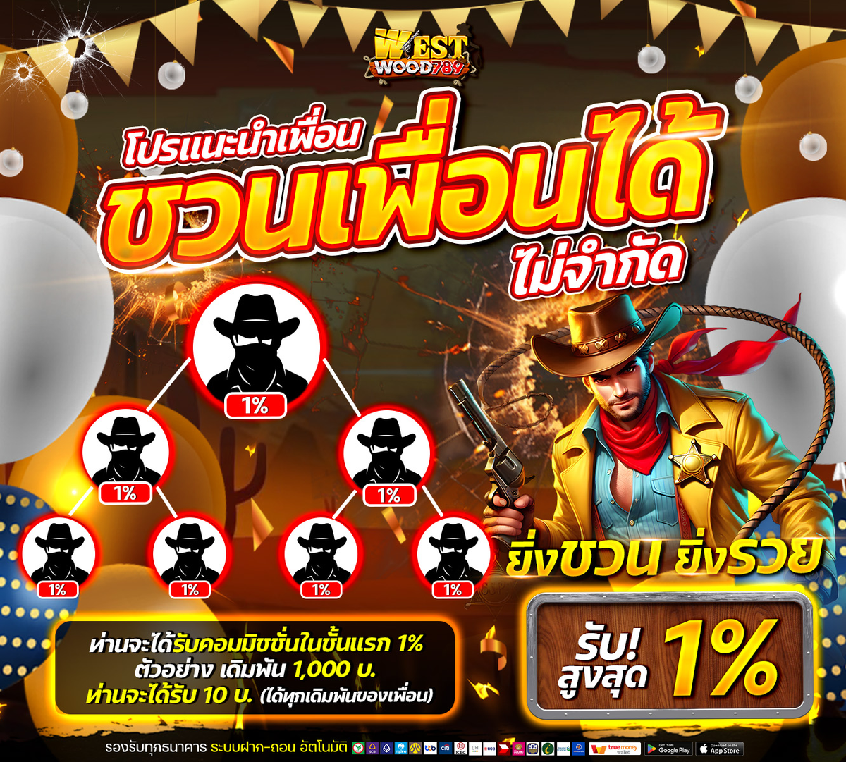 ชวนเพื่อนมาเล่นกับ WESTWOOD789 ไม่ว่าเพื่อนจะได้หรือเสีย รับส่วนแบ่งทันที 1%